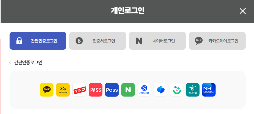 국민연금 납부액 조회 인증 방식은 총 4가지입니다. 간편 인증 로그인, 인증서로고인, 네이버로 그인, 카카오페이 로그인 나에게 맞는 인증방식으로 선택하여 "로그인"을 해줍니다.