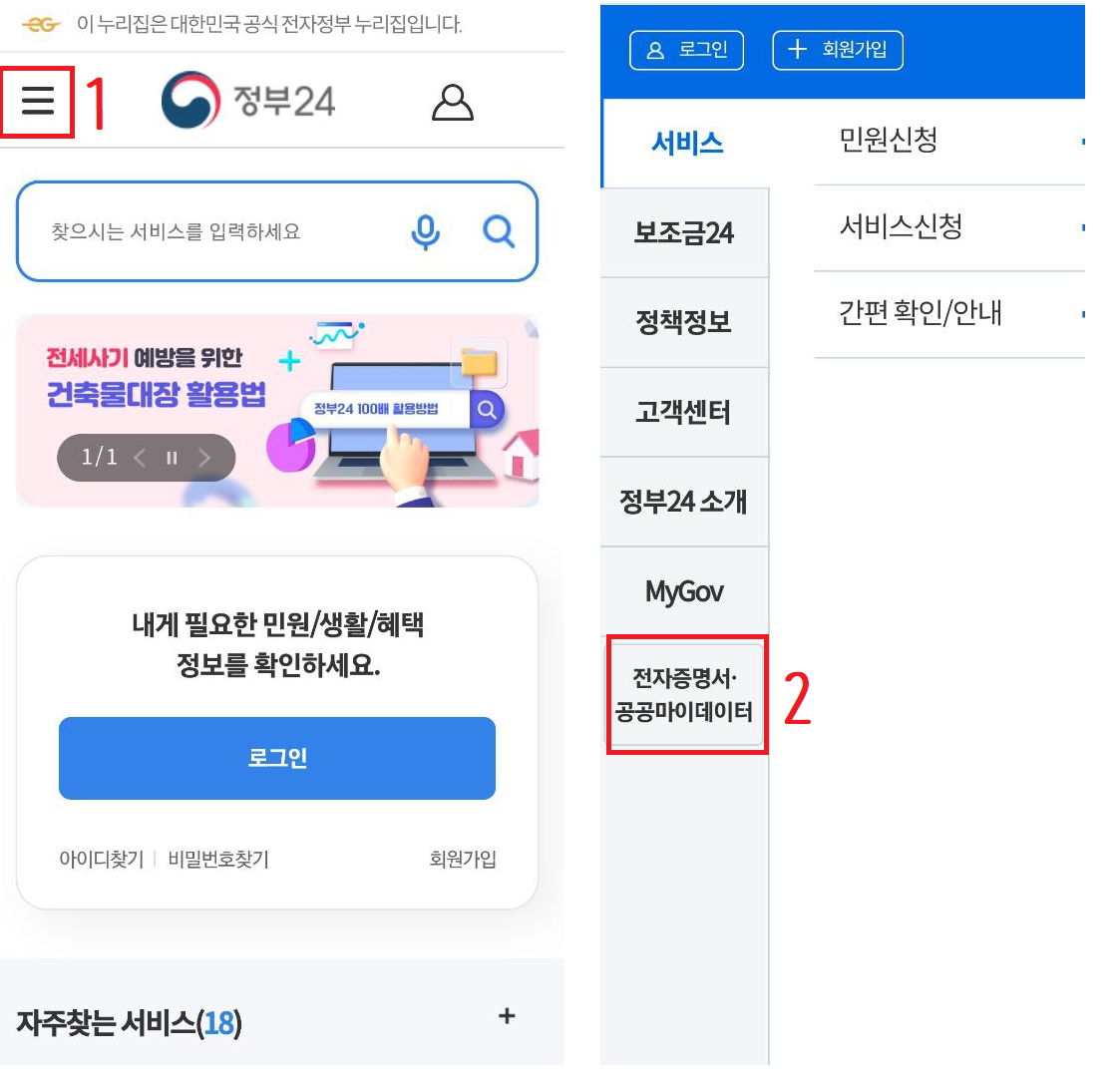 플레이스토어 또는 앱스토어에서 "민원24"를 검색해서 다운 및 실행을 해줍니다.